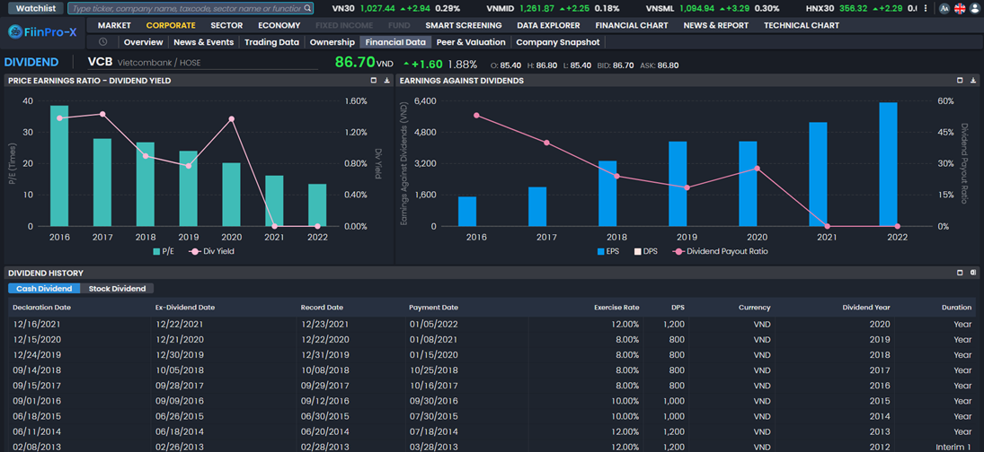 Both Cash dividend and Stock dividend consist of three main parts: Price Earnings Ratio - Dividend Yield, Earnings Against Dividends, and Dividend History.