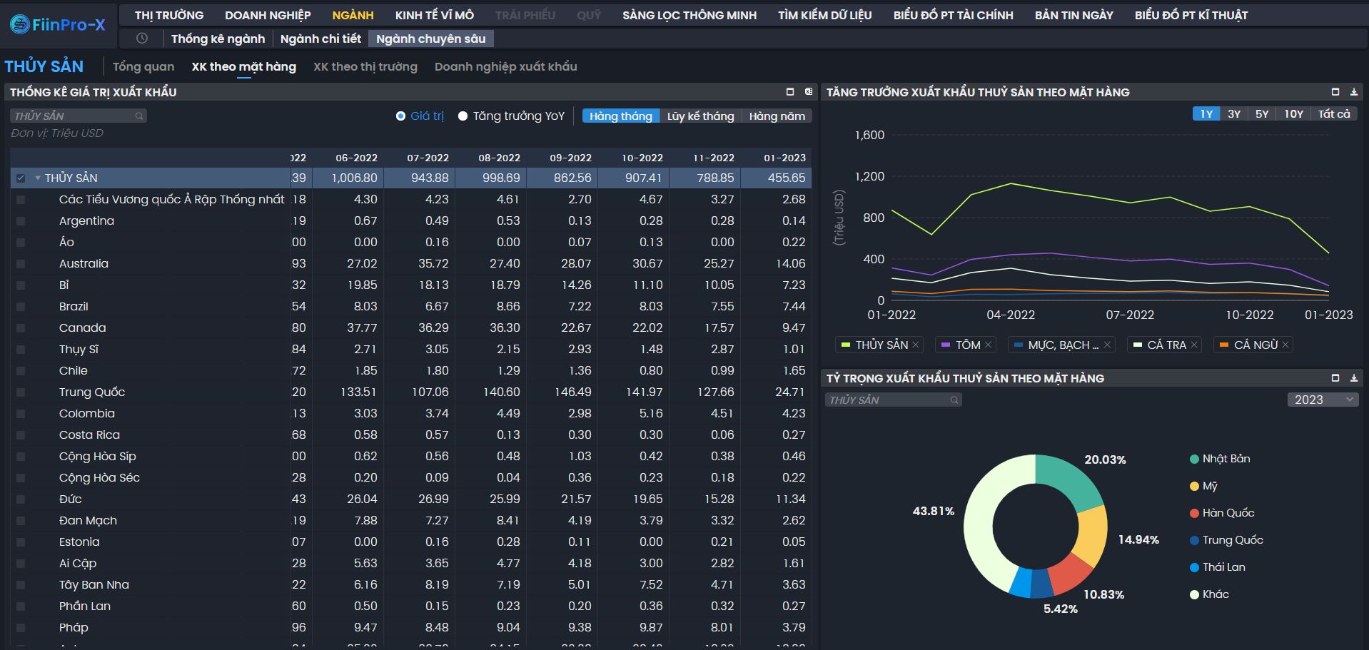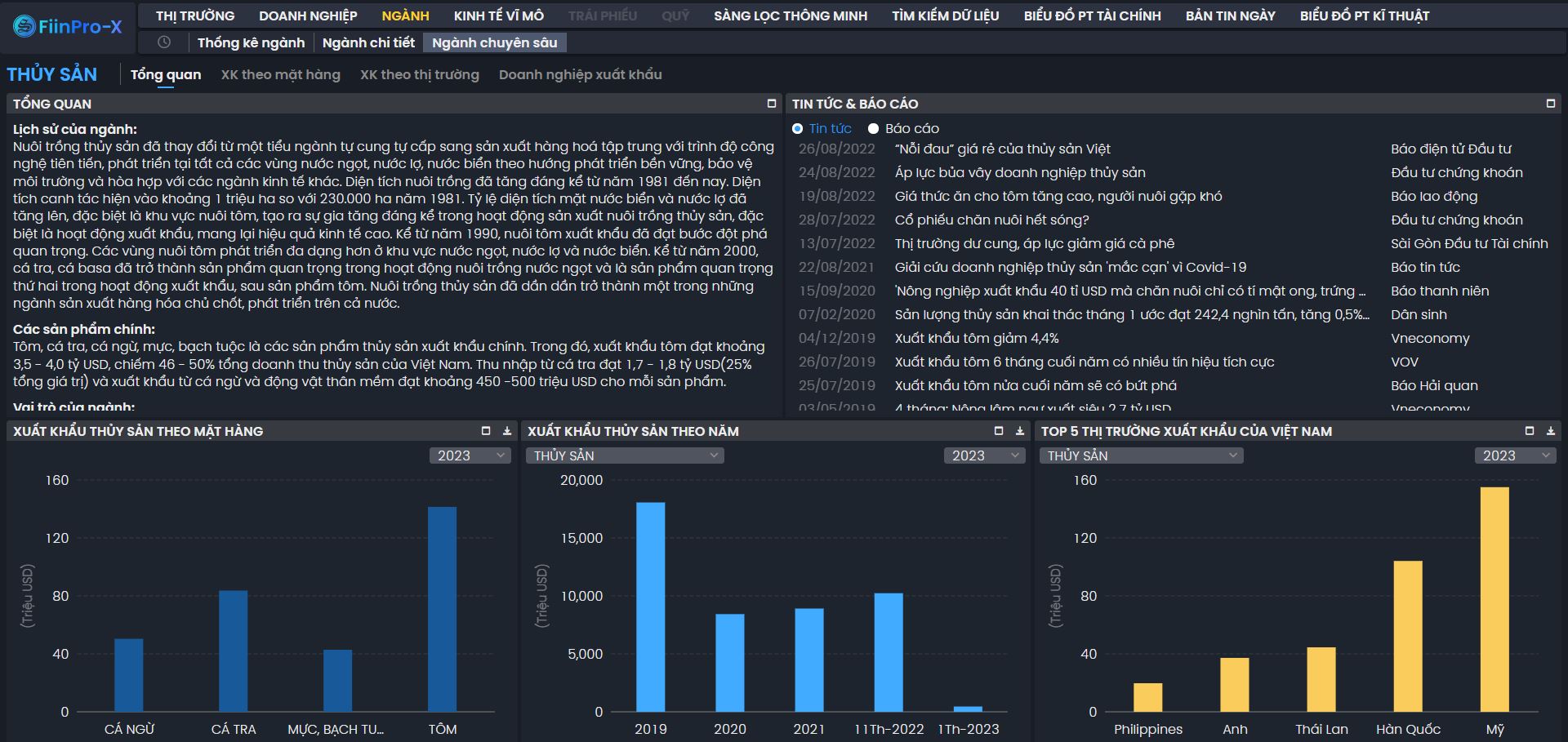 Cung cấp dữ liệu theo từng mặt hàng: Thủy sản, Tôm, Mực và Bạch tuộc, Cá tra, Cá Ngừ