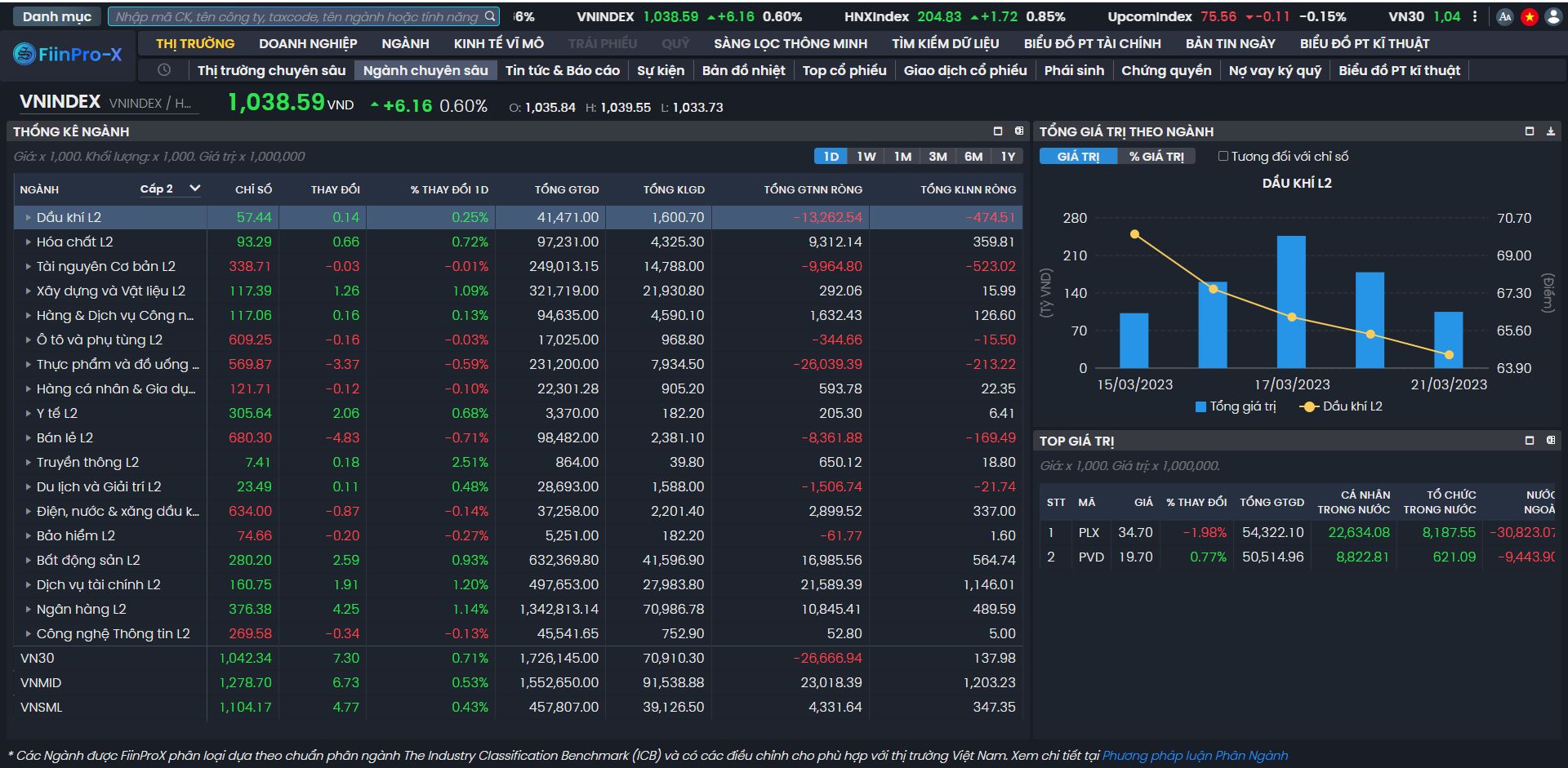 Tổng hợp các chỉ số chứng khoán của tất cả các ngành chia theo tiêu chuẩn ICB. Với mỗi ngành sẽ hiển thị Tổng giá trị vàTop giá trị của các doanh nghiệp trong ngành đó.